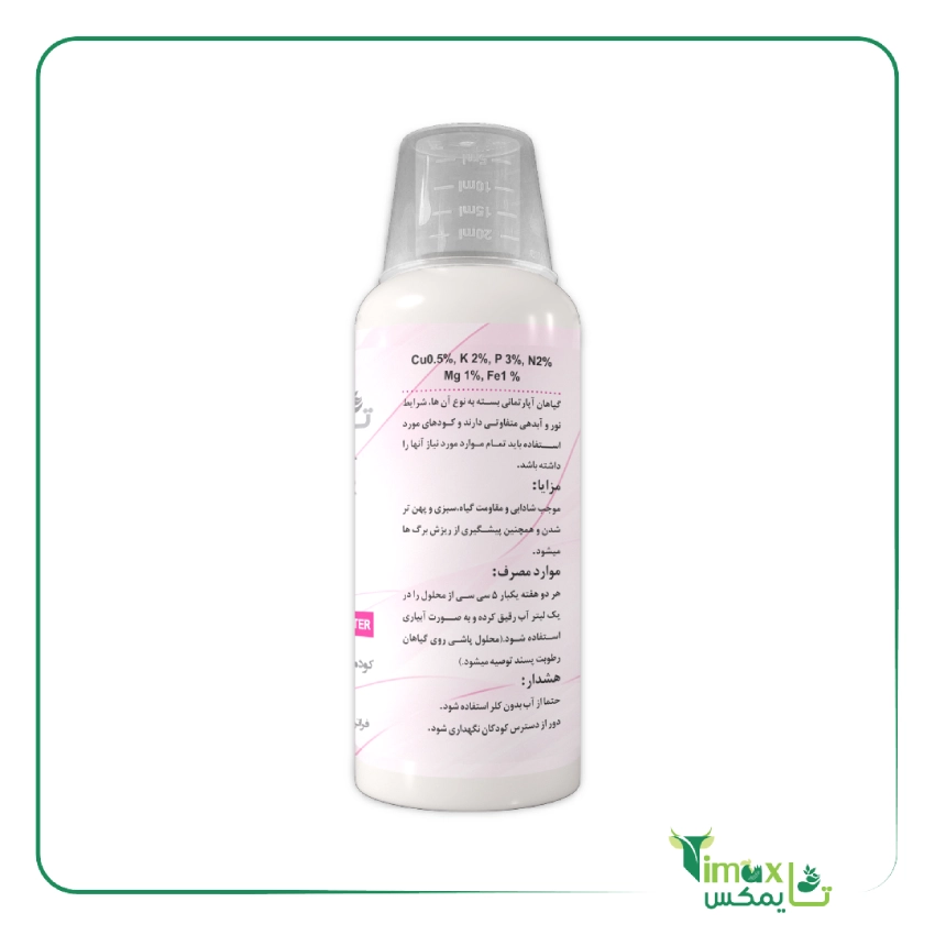 • قبل از استفاده، دستورالعمل مصرف به دقت خوانده شود. _قبل از مصرف، بطری کود را به خوبی تکان دهید و در ظرفی که می‌خواهید محلول آب و کود را آماده کنید تا نیمه آب بریزید سپس کود را با دوز تعیین شده اضافه کرده و به خوبی هم بزنید و مابقی آب لازم را به ظرف اضافه کنید و مجدداً به خوبی هم بزنید و استفاده کنید.